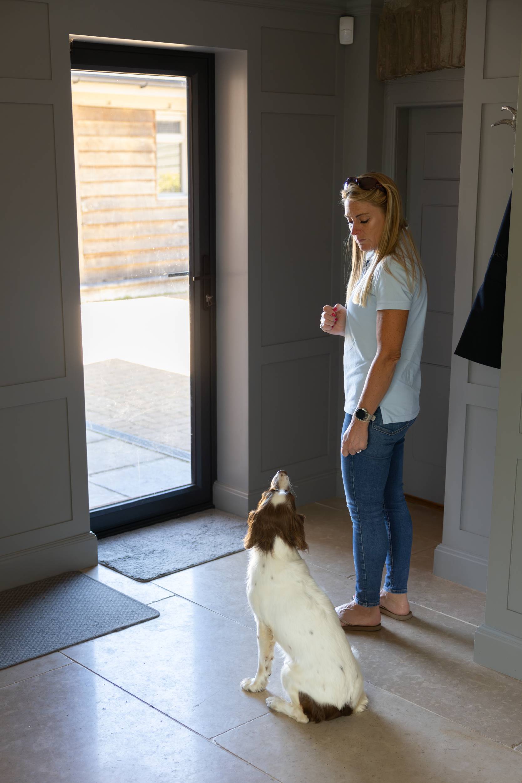 We should also avoid being too energetic or excited. How many of us get really excited and use a high-pitched voice when praising our dogs, only to then wonder why they become overexcited? I often advise my clients to talk to visitors before they arrive, explain that they are training the dog to be calmer when new people come to the house, and ask them to enter without making a huge fuss, for that very reason.